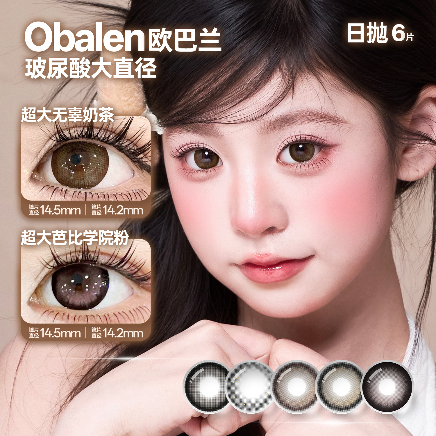 【超大直径日抛】Obalen欧巴兰玻尿酸大直径系列日抛6片装水凝胶彩色隐形眼镜
